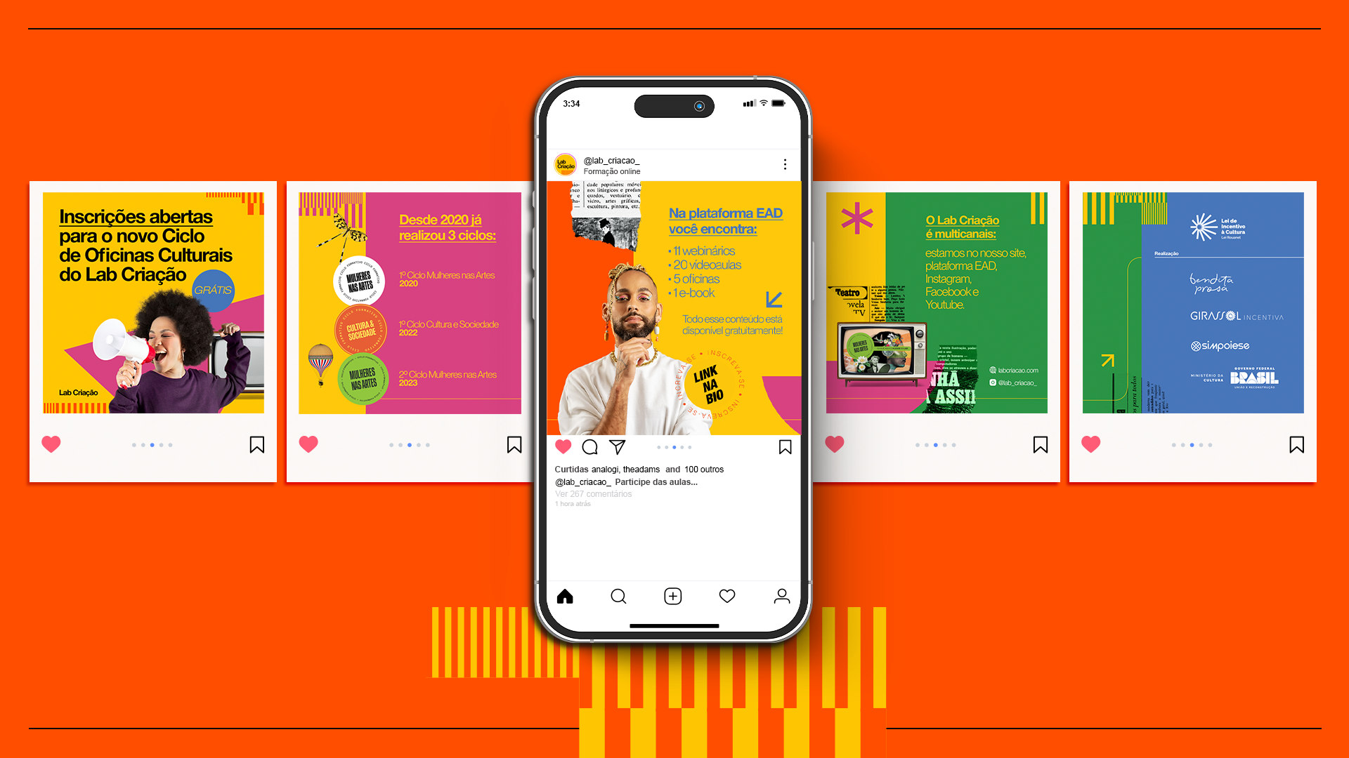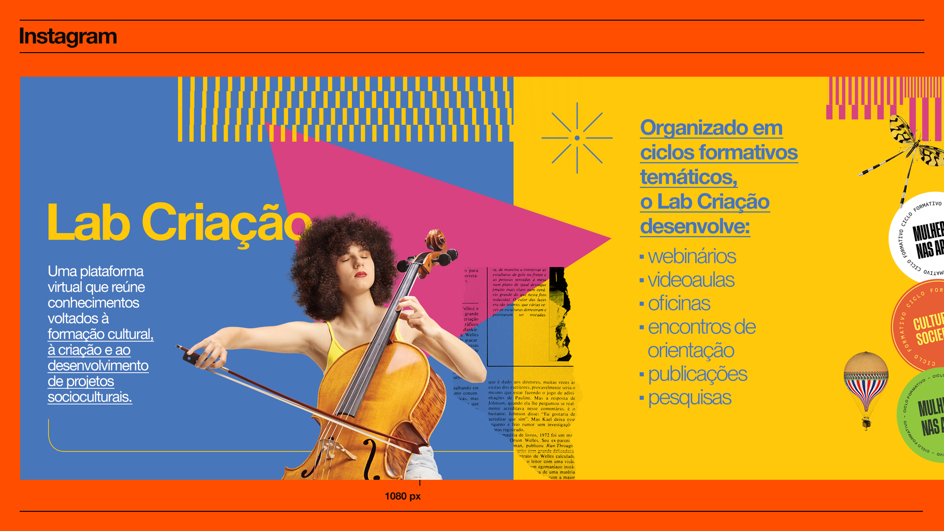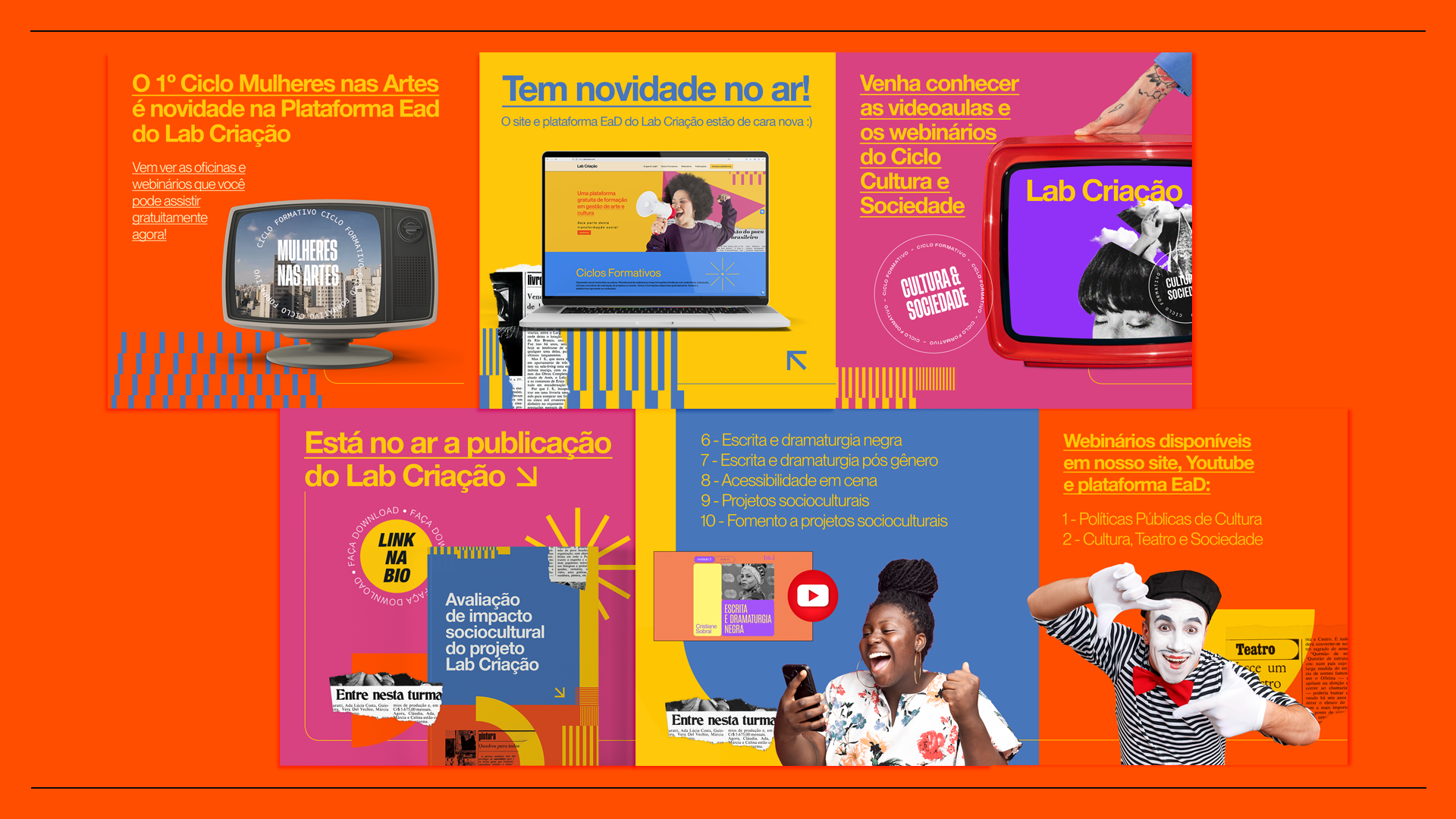 Redesign da identidade visual para o Lab Criação, plataforma gratuita para formação em gestão cultural. Criação de peças para divulgação online e projetos editoriais.