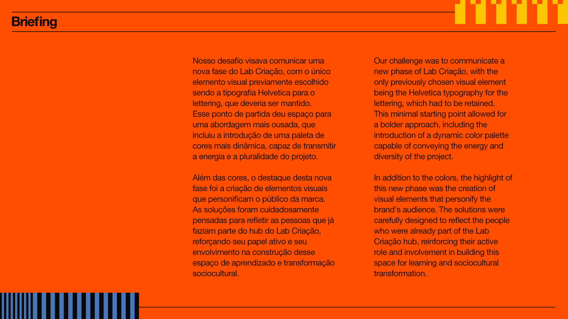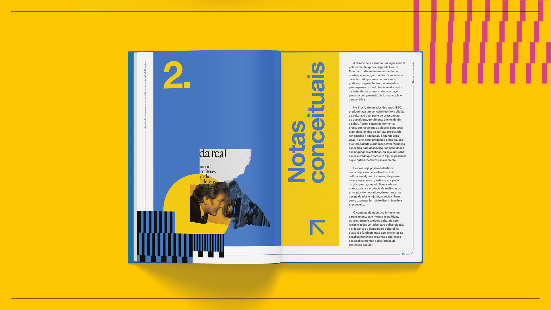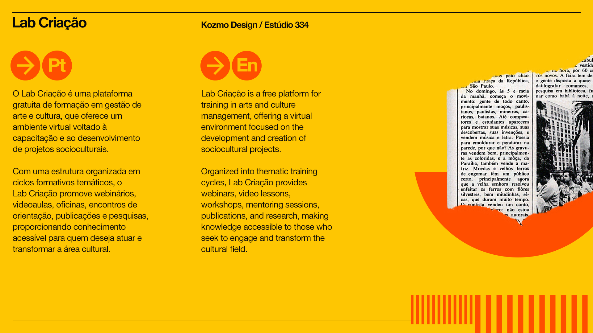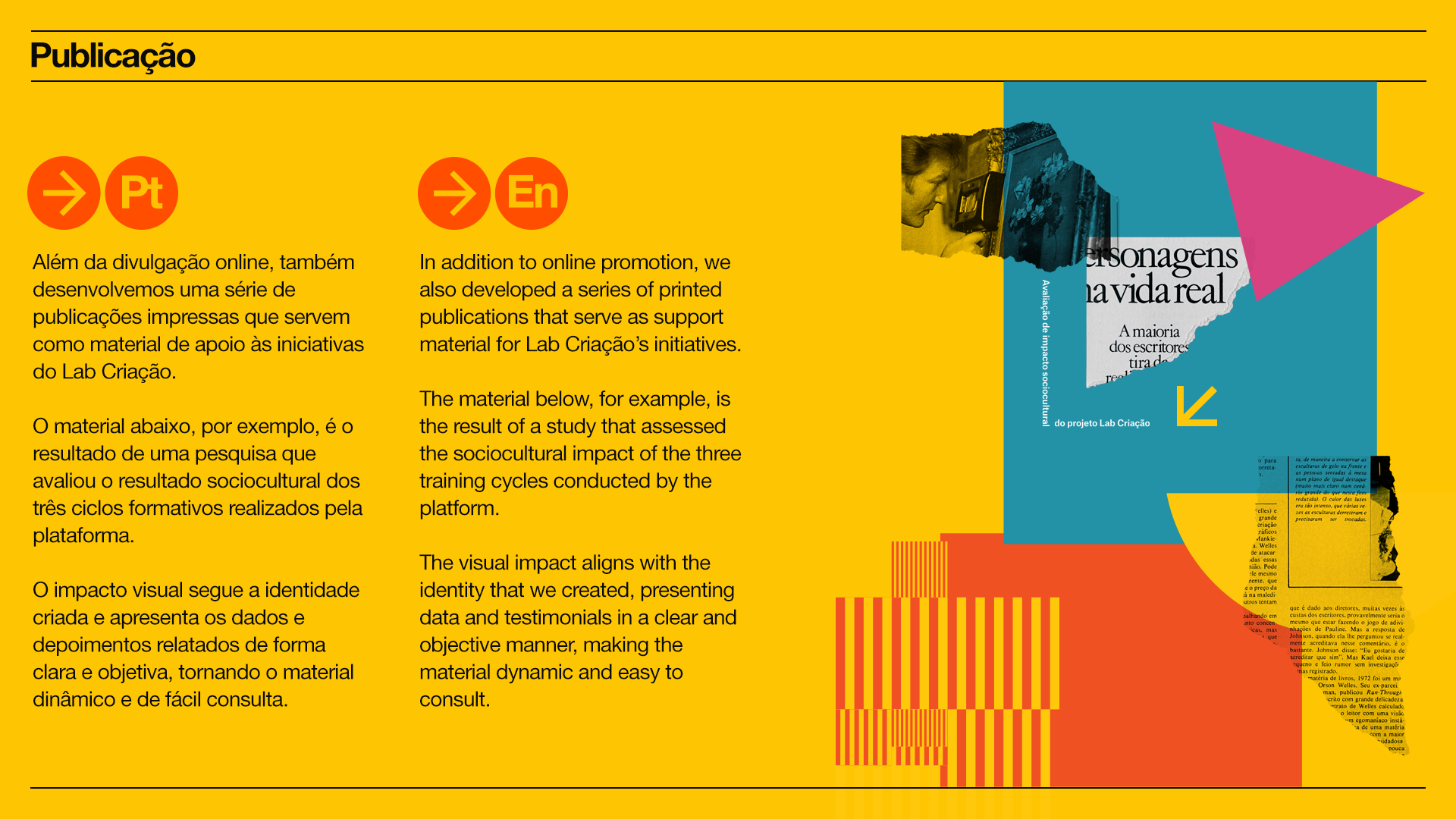 Redesign da identidade visual para o Lab Criação, plataforma gratuita para formação em gestão cultural. Criação de peças para divulgação online e projetos editoriais.