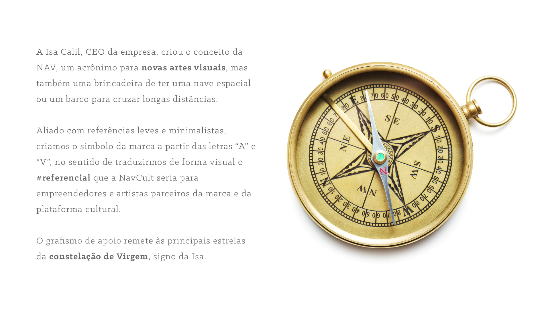 A Isa Calil, CEO da NavCult, nos convidou para criar uma marca que traduzisse visualmente sua nova empreitada profissional a partir de referências pessoais, algumas mais estratégicas e uma forte inspiração minimalista. O resultado foi uma identidade visual única e elegante, alinhada com os conteúdos disruptivos de ativação cultural e inovação urbana da empresa