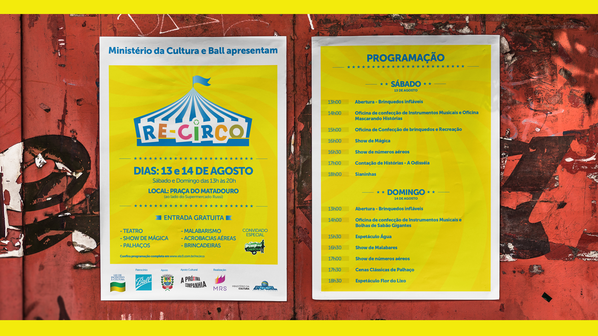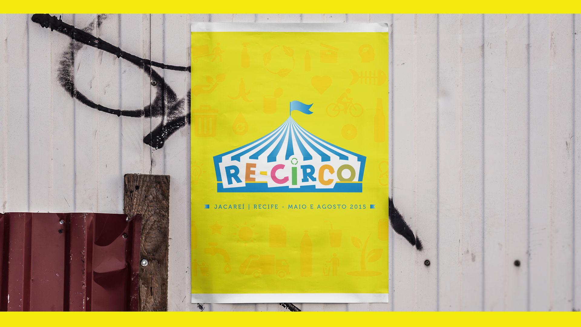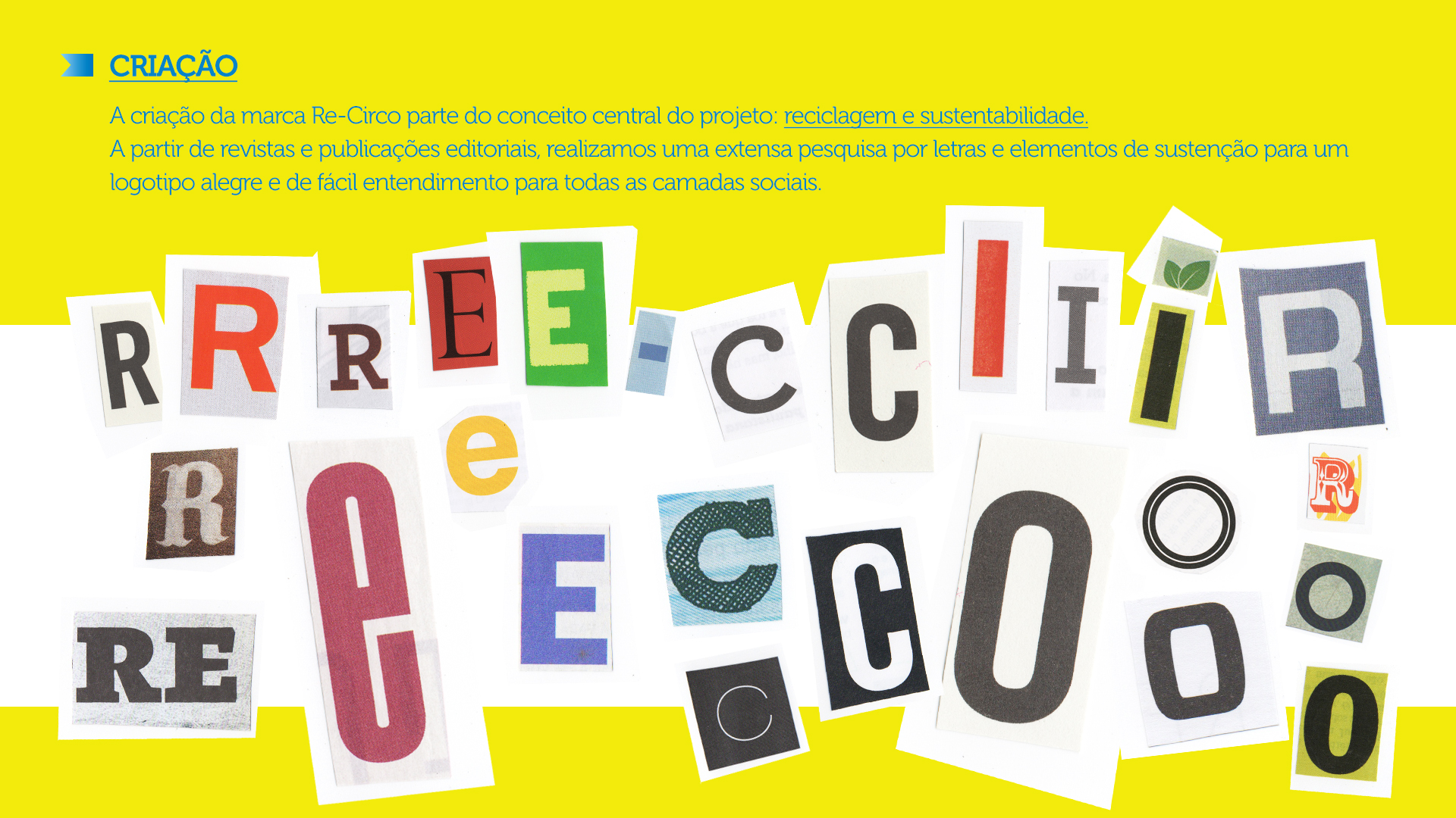 Projeto gráfico para o projeto cultural Re-Circo, circo itinerante com foco em meio ambiente, reciclagem e sustentabilidade.